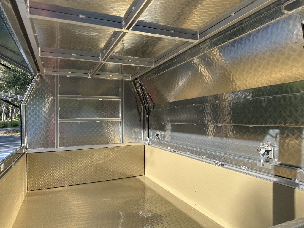 The CS – 4.9 comes with a 125 x 75 x 4mm heavy duty, powder coated chassis and tub. The internal tub measurements are 2.4m long x 1.5m wide with extra height 450mm sides. With the option of a 600mm High Removable Cage and Height Adjustable Ladder Racks. As well as a rear, drop down tail gates and full length side steps for easy roof top access.
