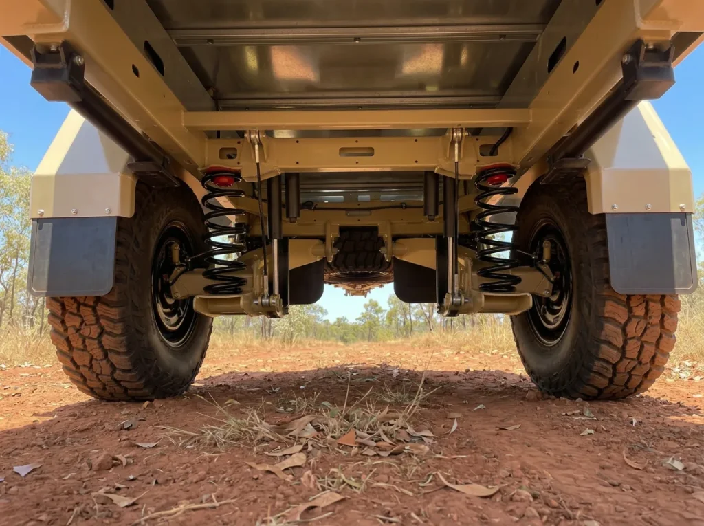 The L.T.S.T.’s suspension is built for a lifetime of Heavy Duty Off Road use with ability to incorporate interchangeable key suspension components allowing the trailer to be upgraded as your needs change. The base model is fitted standard with a coil spring/drum brake configuration with the option of upgrading to air bag and disc brakes variants at any time in the suspensions life cycle.